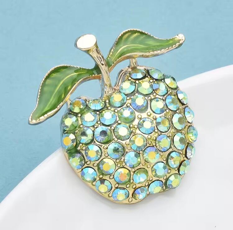 ラインストーンをたっぷりあしらった、人目を惹くような輝きの青りんごブローチです。