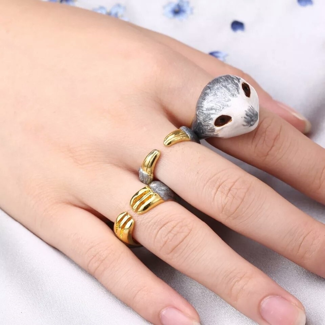 同じ指につけても、別の指に分けてつけてもなまけものが横にぶら下がっているように見えてキュートです。
