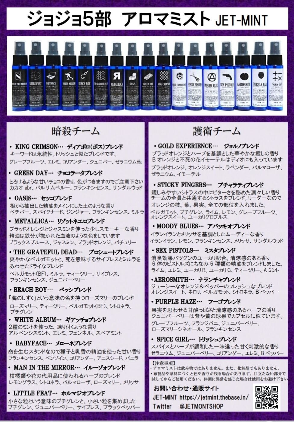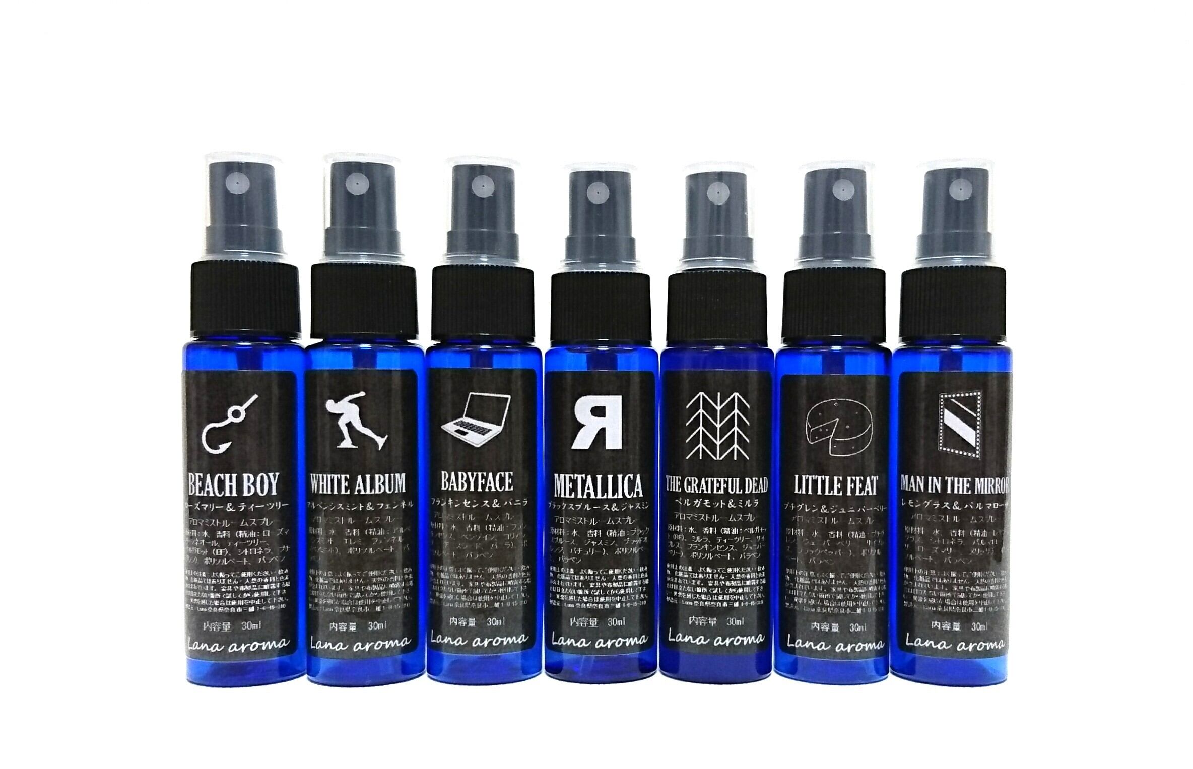 ジュニパーベリー、クラリセージ、パチュリー、シダーウッド、フランキンセンス、ユーカリグロブルス。