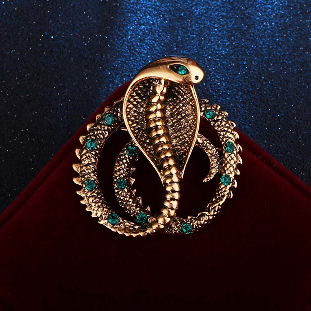 鎌首をもたげるコブラのブローチです。 ヴィンテージ加工のゴールドに、深いエメラルドのラインストーンが高級感を演出します。